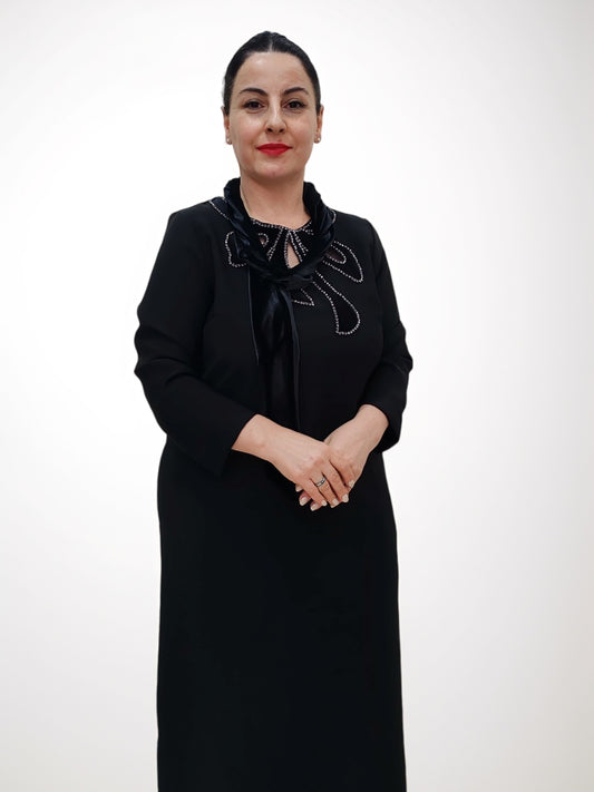 სვოროვსკის ნაქსოვი ტანსაცმლით შეკერილი კაბა შიფონის კონცხით - ელეგანტური და კომფორტული