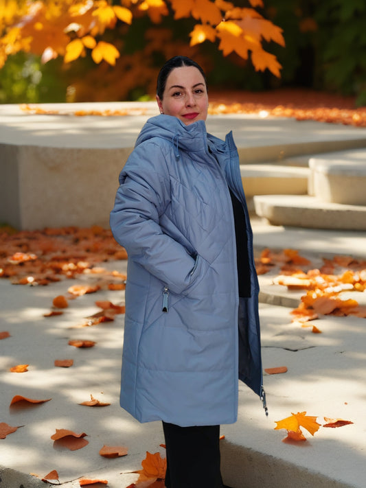 ლურჯი ქალის ქურთუკი გვერდითი პანელებით - კომფორტული და სტილური არჩევანი ყველა სეზონისთვის